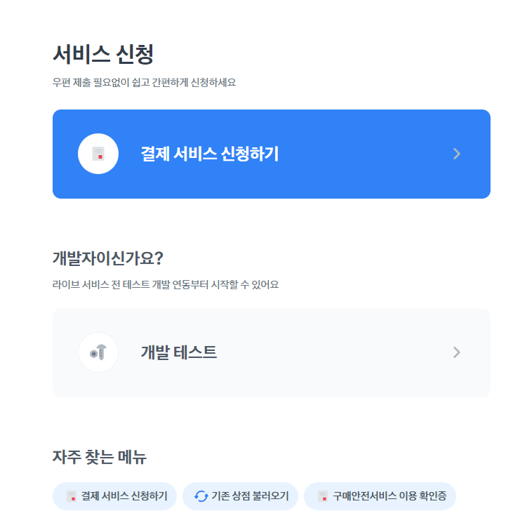 먼저 토스페이먼츠 홈페이지에 들어가셔서 회원가입 후 결제 서비스 신청하기와 개발테스트가 나오는데 저는 개발 테스트를 위해 개발테스트를 하였다.