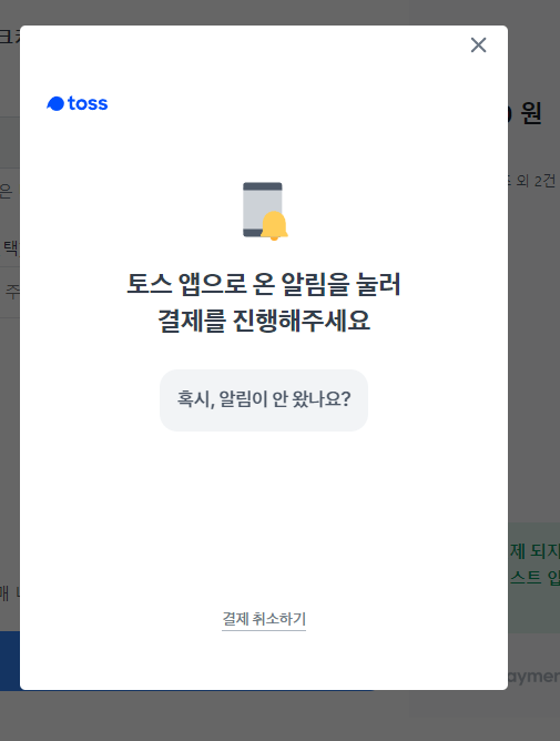 결제창이 띄워지면 상품명과 결제 금액 그리고 동의 창이 띄워진다.